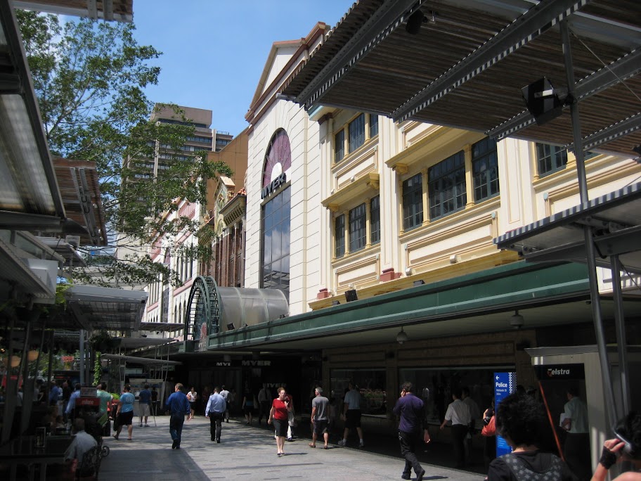 Для планирования своего пешего маршрута по Брисбену мне очень важно было знать, где же остановится трансфер. А заранее это пассажирам не сообщается, и узнать до круиза официально невозможно. Еле нашёл где-то наткнулся, что люди из предыдущих круизов, останавливавшихся в Брисбене, начинали маршрут от супермаркета MYER. Его я и взял за отправную точку. В итоге немного ошибся, буквально на ширину одного дома. Остановились на соседней улице у отеля Хилтон.