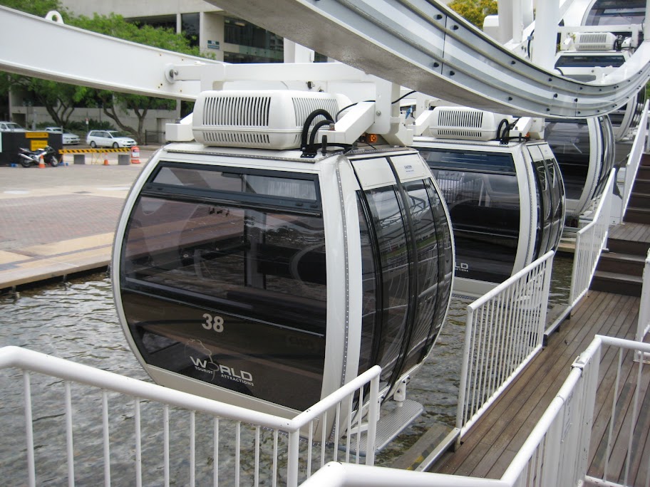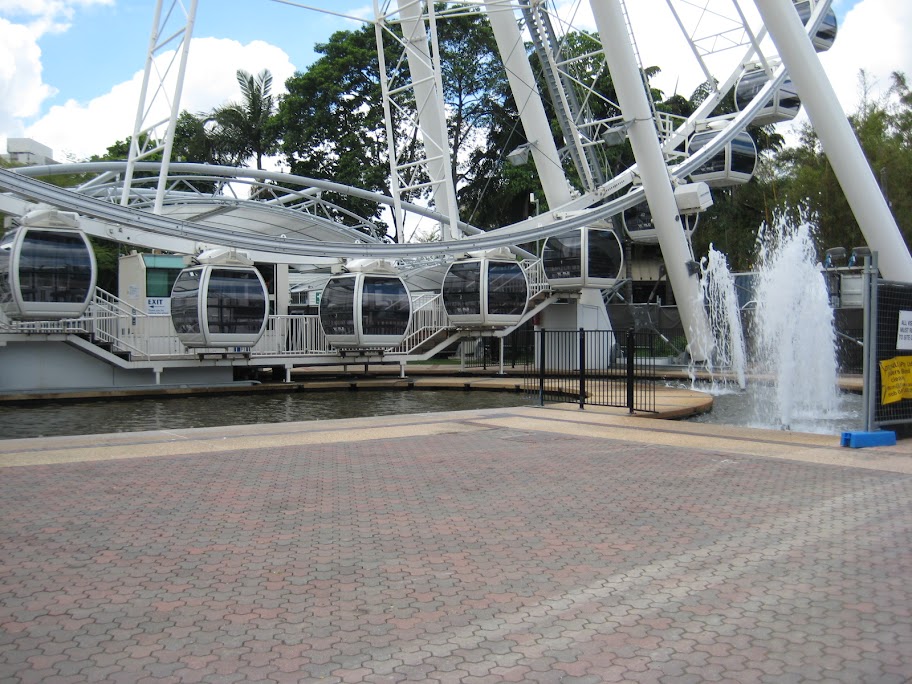 Так я дошёл до колеса обозрения Brisbane Wheel почти ровно к открытию, как и планировалось. Несколько стаек туристов ещё раздумывали, лезть ли на него, а у меня билет был куплен заранее, так что я полез и оказался единственным пассажиром на всём колесе. Это колесо работает не как у нас и в Сингапуре - оно крутится не медленно, выселяя и заселяя каждую гондолу на один круг. А сначала заселяют всё колесо, потом оно в шустром темпе делает 4 круга и выселяют всё колесо.