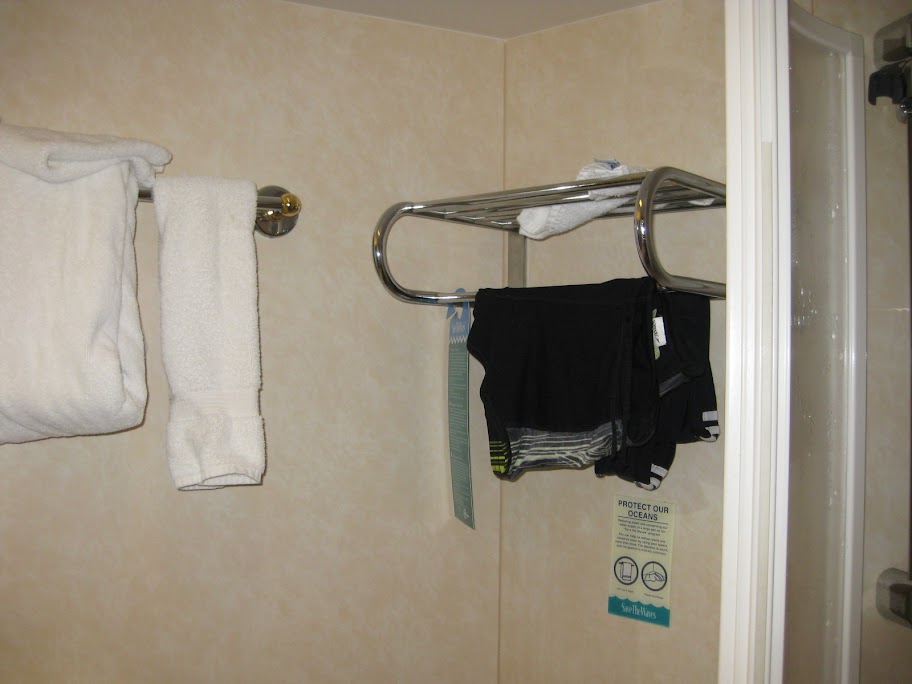 Я уже перечислял всё, что мы делали в каюте, но забыл один пункт. Мы там ещё стирали. Вообще, я не приветствую всякие постирушки на отдыхе, и потому мы отдавали в стирку все вещи, вплоть до трусов-носков. Но отдать вещи в стирку - значит получить их только на следующий вечер. Поэтому кое-что, чего не было в нескольких эксземплярах, мы могли и сами постирать в каюте от нечего делать. Вот только потом сушить было неудобно. В комнате некуда повесить, а в санузле часто влажно.